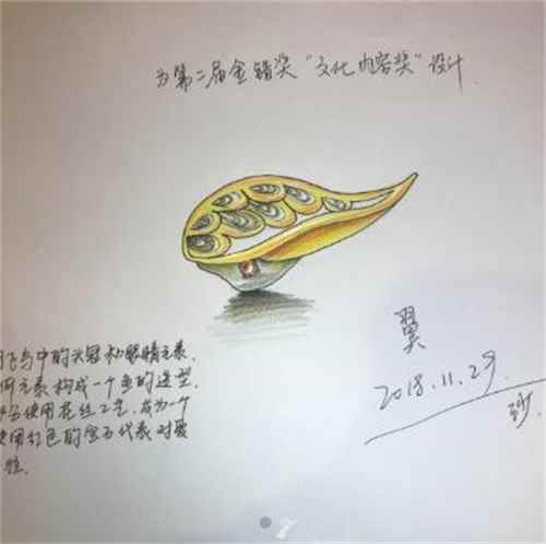 首批初审作品亮相 颠覆传统美感炸裂 目前,赛事首批通过专业初审的设计作品已在错app上“金错奖”专业页面公布,除了手绘稿还有部分视频展示,现在就让我们一同来欣赏部分人气作品吧。 ▼人气作品欣赏▼ 【翼】 作品编码:105794 部位:胸针 飞鸟与游鱼,是《自由幻想》手游的一大经典剧情。本作品以飞鸟中的头冠和眼睛元素,结合几何元素构成一个鱼的造型,头冠部分使用花丝工艺,成为一个凸面,使用红色宝石作为眼睛代表队爱情的向往。本作品在采用指定游戏元素的基础上,不仅拥有传统元素,还拥有现代的形式感,符合本次大赛的主题。