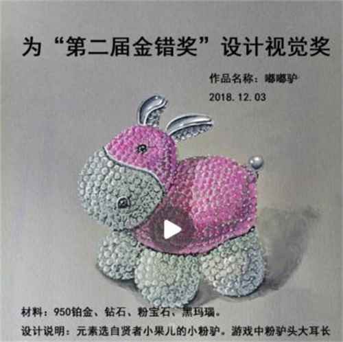 【嘟嘟驴】 作品编码:107080 部位:链牌,吊坠 作品设计灵感来源于中国传统文化里“八仙过海”之一的张果老的小粉驴。游戏中元素大耳朵四肢圆润,设计采用钻石与粉宝群镶的搭配给人以一种奢华的美感。作品的颜色受诗句“还嫌踏碎娇花影,款款扶缰倩墨娥”的启发,以粉白相结合,两色交相辉映浑然一体。驴儿通身圆润不露锋芒,且性情温顺,如同受时光之力影响的贤者果儿一样温润有礼。