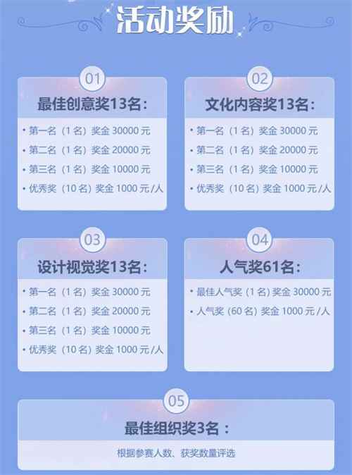 其中,八仙元素是根据游戏中的仙缘卡牌、仙缘任务的世界观演变而来的。八仙传说作为国家级非物质文化遗产,拥有悠久的演变历史和广泛的民间影响力;从十三年前《QQ幻想》端游诞生,到今年《自由幻想》手游受到玩家热捧,八仙一直是游戏的主线故事,铁拐李、吕洞宾、张果老、曹国舅、何仙姑等神话人物,化身NPC陪伴玩家一起成长的,让无数玩家在游戏中感受到中国经典神话传说的魅力。 让时间孕育伟大的作品 大赛截稿时间延长 为了鼓励更多设计师的参与,组委会宣布作品设计投稿期间延长至2019年3月25日,期待全球设计师投递更多优秀作品。本次大赛设立“最佳创意奖”“文化内容奖”“设计视觉奖”“人气奖”4大奖项,合计高达30万人民币的奖金。不仅如此,大赛最终投票选择出的优秀作品不仅可被制成实物在线上进行推广,还有机会被开发入游戏中让玩家在游戏中体验。此外,大赛作品更有机会参与到后续线下的展览,设计者与产品都能得到优质曝光。