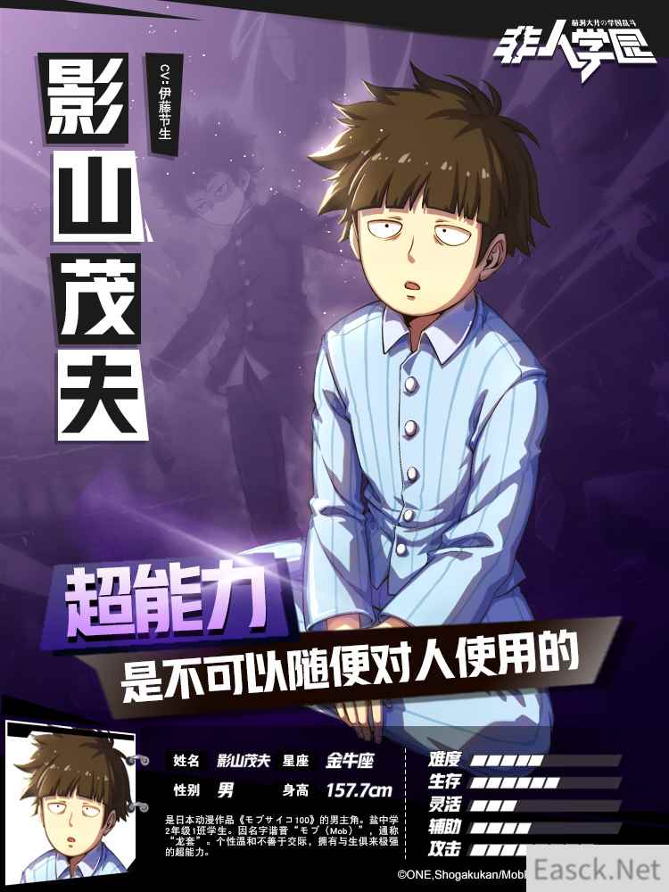 影山茂夫定位&技能简介 在学园战场,影山茂夫是一名【灵能】英雄,虽然他本身很想加入体(肉)术(改)。影山茂夫拥有较强防御力,以及持续输出能力和爆发能力。