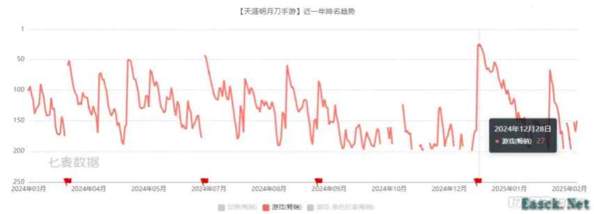 在12月27日,赛季制版本正式上线时,项目组甚至还端出“每天抽取一位少侠送100股腾讯股票”的营销奇招(相当于每天送价值3万的现金),试图召回天刀老玩家。 从数据来看,赛季制改造在初期确实取得了一定成效。在赛季制版本上线当日,天刀手游在iOS畅销榜从200名开外猛冲到到了27名。