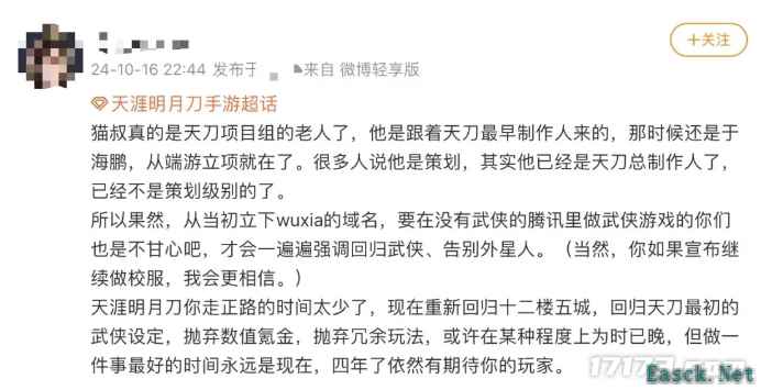 相比在老房子里修修补补,平地起高楼确实可以放得很开。 为了扭转天刀数据持续下滑的颓势,在2024年10月,猫叔带领天刀手游项目组进行了一场长达3个小时的真·直播(不是现在流行的播片式的假直播)。