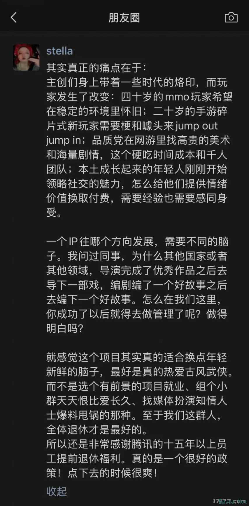 然而,不到一个月,天刀手游的业绩再次出现了下滑。回顾整个春节档期,2025年1月和2月天刀手游在iOS端的总流水与2024年同期基本持平。 究其原因,还是改革不够彻底的造成的。尽管天刀手游拥抱赛季制,但仍在一定程度上保留了老玩法。对此,老玩家抱怨赛季制不过是数值换皮,新玩家则认为入门门槛过高。 谈及推动天刀赛季制改革可能出现的失败,猫叔在去年10月接受媒体采访时曾说:“任何实践,哪怕是错误的,只要能吸取教训,我们就还有可能在这款产品里改掉,或者在下一款产品里解决问题。” 很可惜,资本耐心太少,没有继续给他留出解决问题的时间。 今年3月份,网上传出了猫叔和顾婷婷离职的消息。 在顾婷婷选择离职后,发布了一条朋友圈,我们或多或少能够感受到二人选择在当下离职的原因。