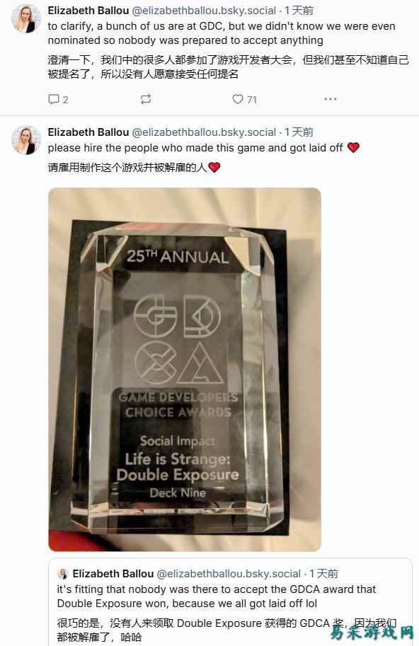 《奇异人生:双重曝光》在2025年游戏开发者选择奖(Game Developers Choice Awards)上荣获社会影响奖。然而由于本作销量不佳,开发商Deck Nine Games在经历多轮裁员后导致无人出席领奖。 近年来行业竞争异常残酷,这一事件深刻揭示了当前游戏行业的严峻现状。《奇异人生:双重曝光》的叙事设计师Elizabeth Ballou在Bluesky上写道:“没人去领GDCA奖很合适,因为我们都被裁了,哈哈。我们中的一些人参加了GDC,但我们甚至不知道自己被提名了,所以没人准备好去领奖。” Game File的Stephen Totilo当时在后台,他写道:“几乎所有获奖游戏都有人上台领奖、手捧奖杯、笑容满面,但《奇异人生》获得社会影响奖时却空无一人。”Ballou后来证实开发团队的成员最终领取了奖杯,不过是在台下匿名领取的。 |