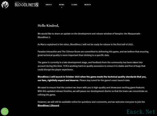 Paradox官方宣布《吸血鬼:避世血族2》再度延期 预计2025年10月推出
