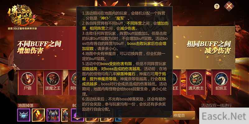 PVP&PVE多模式混战 开启爽快大乱斗 在神魔之战中,玩家需要面对的,不仅仅是分布密集的群怪,战斗力爆表的Boss,还有来自其他玩家的威胁。击败任何阵营玩家,都可以提升自身的阵营buff层数,因此为了能够获得更高层数的阵营buff,玩家间势必会频繁爆发混战。不过如果击败的玩家buff层数为0时,将不会获得buff层数的提升。而爽快大乱斗将在活动期间达到巅峰,随着六大Boss的登场,为了争夺Boss,玩家间更是将爆发热血团战。需要注意的是,六大Boss也有各自的阵营与buff,Boss击败玩家后也会增加buff层数,请多多小心。