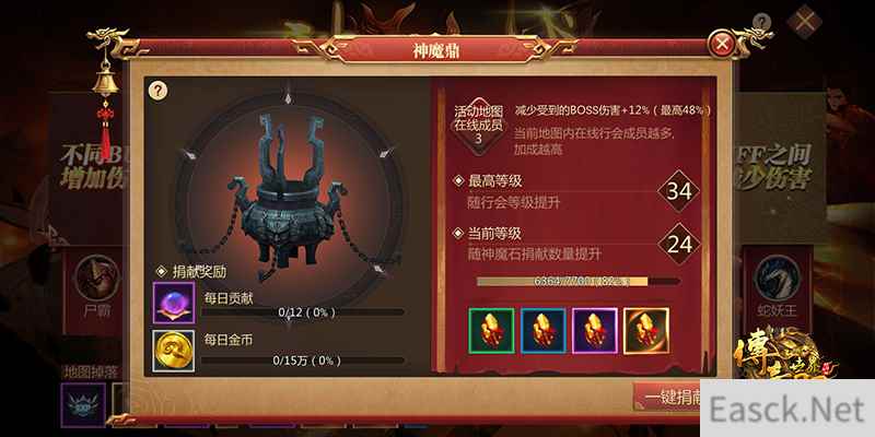 神魔石可捐献给神魔鼎用以提升神魔鼎的等级,神魔鼎等级越高,活动期间行会在线成员越多,Boss对行会成员造成的伤害也会越低。因此玩家想要赢在起跑线上,赶在活动阶段前获得尽可能多的神魔鼎buff加成,就需要在常规阶段努力获取神魔石,提升神魔鼎的等级。不仅如此,当玩家捐献神魔鼎经验达到50、100、1000等指定数额时,还可以获得锻体丹、金币的捐献奖励,锻体丹可用于装备修行锻体,提升装备位的基础属性。值得一提的是,神魔石每日清空,玩家需要每日及时捐献。