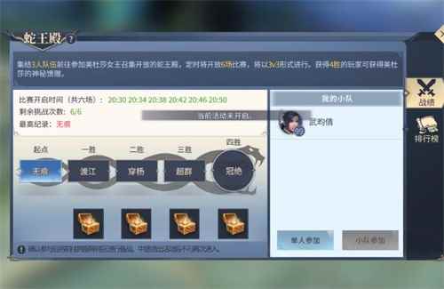沙之澜歌·套装 珍稀道具、限定时装更有Q币福利 联动玩法惊喜来袭 由《斗破苍穹》动画番外篇2“沙之澜歌”蛇人一族供奉的战神之地“蛇王殿”,所衍生的《斗破苍穹手游》“蛇王殿”3V3跨服竞技场将于4月19日震撼上线!为联动《斗破苍穹》动画特别篇剧情,蛇王殿将由新一任美杜莎女王全面解锁,广大斗者可单人也可组成3人队伍前往挑战,得胜方可获得美杜莎女王的神秘馈赠——参与奖、胜利奖、排名奖,符合任一条件都能解锁对应奖励。