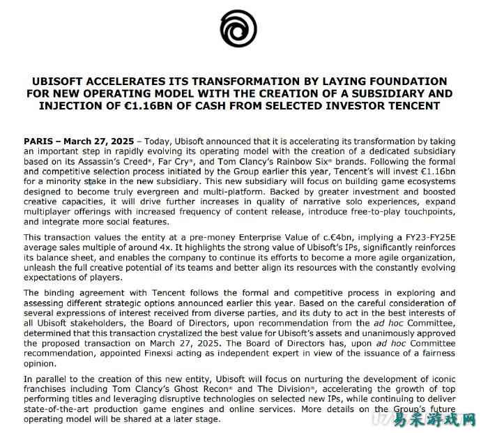 根据育碧发布的官方声明,尽管腾讯将成为新公司的主要股东之一,但新公司的运营控制权仍将由育碧保持。这意味着育碧将继续主导这些知名游戏品牌的未来发展,而腾讯的投资则为公司提供了强有力的资金支持,有助于进一步推动其在全球市场的扩张。 值得注意的是,这家新公司的预估市值高达40亿欧元(约313.24亿元人民币),这表明投资者对育碧旗下这些经典游戏品牌的价值有着高度认可。育碧首席执行官Yves Guillemot表示,选择与腾讯合作是基于对公司未来战略方向的深思熟虑,这一举动不仅标志着育碧的一个重要里程碑,也为公司带来了新的发展机遇。