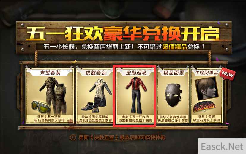 【沙漠定制 限时登场】 4月28日至5月1日,玩家驰骋沙场每日存活时间累计达到15分钟,就能获得五一专属纪念奖杯,而随着存活时间的累积,中级时装补给箱、高级时装补给箱等给力奖品也是各种满足!若是累积存活时间达到120分钟,更有顶级奖励决胜五军宝箱等着你哟!是不是早已迫不及待了? 而在4月28日至5月3日,玩家可以使用五一纪念杯限时兑换沙漠定制夹克和沙漠定制皮裤,让你体验最酷帅沙漠定制套装的独特魅力!