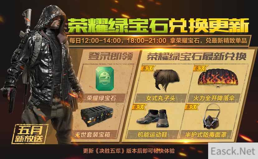 【特色单品 登录就送】 4月28日至5月3日,玩家只要登录游戏,就有豪礼相送!金币、防毒面具、狂野涂装、白色训练鞋、全头小脏辫,只要完成连续登录,特色单品统统拿回家!无论是外出游玩,还是家里闲宅,登录就能拿!千万不要错过哦! 【特定时刻 特殊惊喜】 五一大假期间,《绝地求生 全军出击》还与你千里相约哦!在特定时刻,只要玩家登录游戏就有特殊惊喜哦!4月29日,登录就送末世眼镜和劳动光荣徽章!5月2日12:00至14:00以及18:00至21:00,更有荣耀绿宝石与劳动光荣徽章等你临幸,记得千万定好闹钟,豪情大礼不容错过!