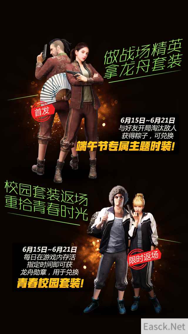 【畅快激战勇夺时装】 小裙子早就满大街都是,早已不能满足玩家彰显独特气质,那么全新的主题时装是时候了解一下?中国风的龙舟主题套装和毕业季特典的中式校服套装,已经为渴望新时装已久的击友们准备在这里了。6月15日-6月21日活动期间与好友开黑、游戏内存活指定时间即可获得粽子与龙舟勋章兑换指定套装。