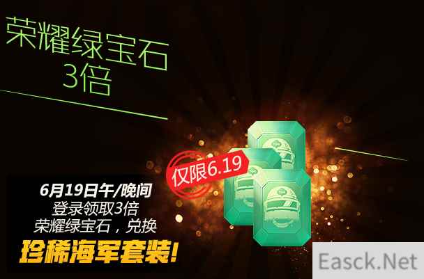 6月19日午间/晚间登录游戏,即可领取3倍的荣耀绿宝石,获取荣耀绿宝石,有机会兑换珍稀海军套装。