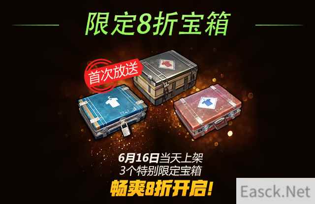 【商城放价 “巧取豪夺”】 喜欢开宝箱享受惊险刺激的开箱瞬间吗?6月16日即将上架3款特定宝箱,全都8折甩卖,每个玩家都能开箱开到手软的限定宝箱,简直想想都畅快。