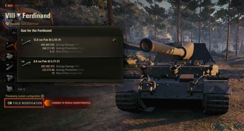 斐迪南 在1.28.1版本,坦克得到如下改动: 4门炮优化成2门炮 只有长88和128炮了 长88炮变成了280单发,232/272穿 战斗室与车体正面的3块从200毫米变成220毫米 车体两侧的肩膀从80变成160 发动机功率、发动机模块血量略微加强 车体旋转速度从21.9变为34.42 发动机起火率从15%变成20% 斐迪南是真正的火力、防护和机动全面加强,在猎豹II被踢到收藏之后,斐迪南成了百突线的必经之路,而它要对位的敌人性能可是一个比一个强,这次也是早就该加强了。 猎虎