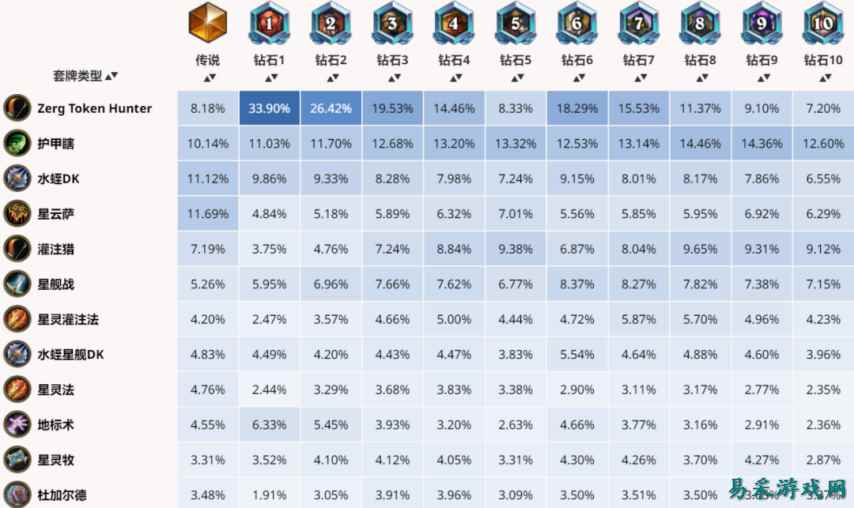 哈喽,我是炉石港湾东少。先给大家看看最近一天国服天梯的卡组出场率统计。目前快攻蛋猎出场率遥遥领先!