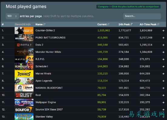 自3月25日正式上线以来,《Schedule 1》每日玩家峰值不断攀升。截至3月28日,游戏的同时在线玩家数突破23.4万,24小时内热度表现超越了《彩虹六号:围攻》《星际战甲》等知名大作,还一举进入Steam历史最高在线榜单的第63位。 >