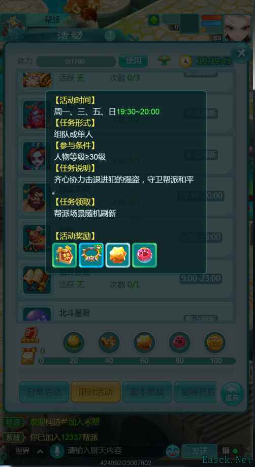 每周一、三、五、日的19:30-20:00,强盗就会攻入帮派,大肆掳掠。少侠可以蹲点等待这些强盗,再一举击溃。这个活动不限制组队,即使单人也可以参与,毕竟保卫帮派人人有责嘛。 【寻找盗匪 直接战斗】
