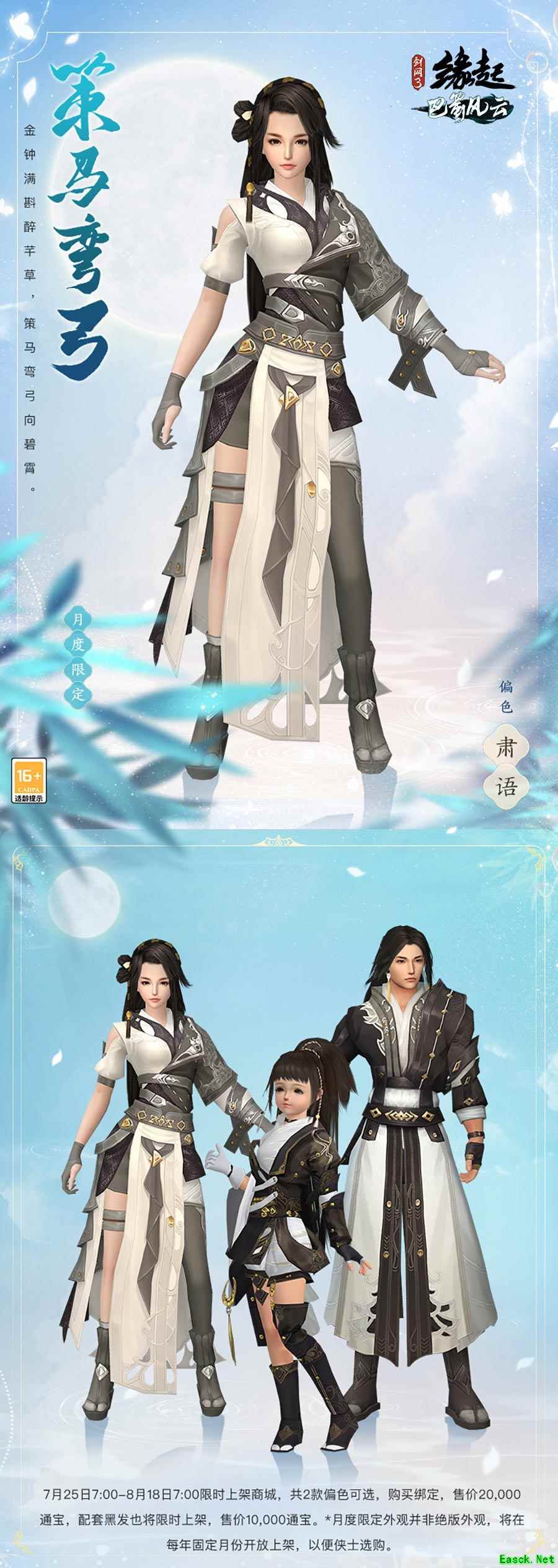 金钟满斟醉芊草,策马弯弓向碧霄。 外装【策马弯弓】7月25日7:00-8月18日7:00限时上架商城,共2款偏色可选,为绑定款,售价20,000通宝,配套绑定黑发也将限时上架,售价10,000通宝。※ 月度限定外装将于来年指定月份返场。 成女款右肩去袖更易策马拉弓。衣衫黑白相间有金饰腾云装点,腰侧皮甲更显巾帼之色。耳侧简单挽起丸子两团,飒爽英姿间又添少女活泼之感。 成男款采用胡服的翻领对襟设计。挽袖束腰利落潇洒,银云暗纹皆纳其间。长发肆意披散,单侧长袖随风飘起,尽显豪放不羁浪客形象。 萝莉款一侧镂空设计翻领滑落至肩。窄袖短裤搭配皮质手套,不对称长短靴以金铝皮带修饰,彰显草原女儿无拘无束的自在本色。马尾高束更是灵动俏皮。