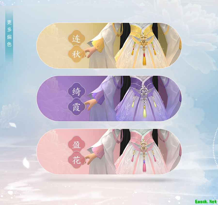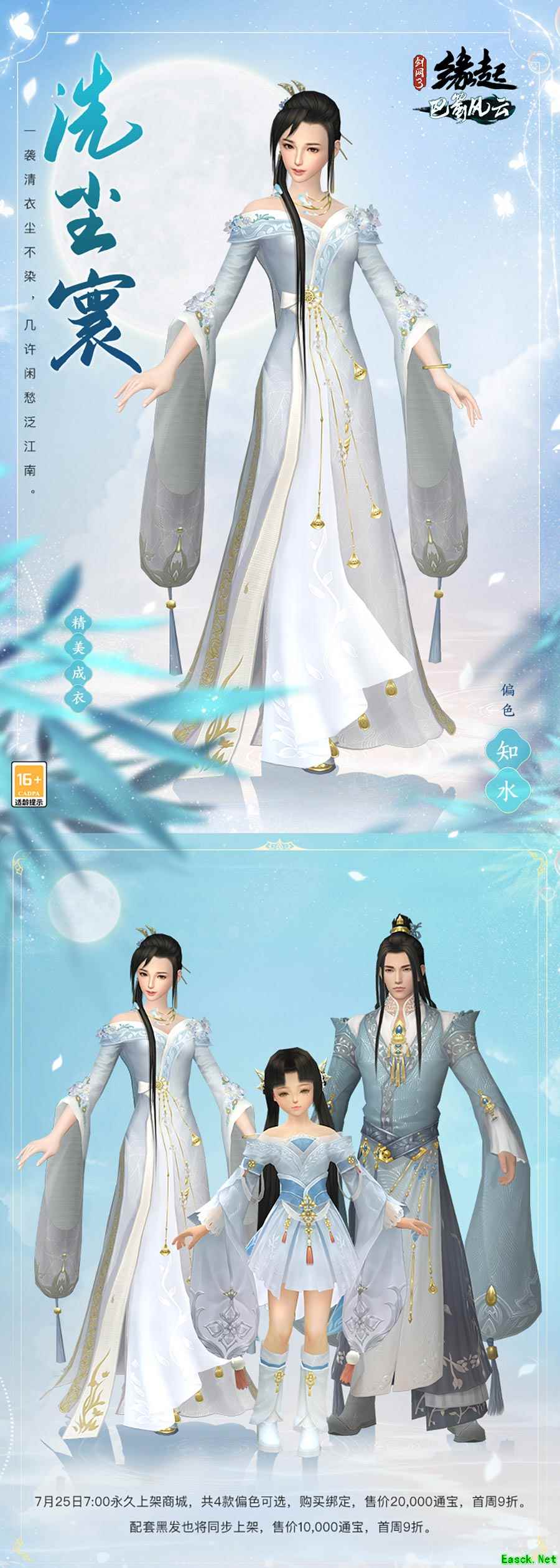 一袭清衣尘不染,几许闲愁泛江南。 精美成衣【洗尘寰】7月25日7:00永久上架商城,共4款偏色可选,购买绑定,售价20,000通宝,首周9折。配套绑定黑发同步上架,售价10,000通宝,首周9折。 成女款蕙心兰质,一缕青丝及腰。飘渺长裙鲜花为饰宛若江南春水,精细银丝暗纹铺陈裙间。腰间金花一别素而不朴,窈窕淑女,白璧无瑕。 成男款温文尔雅,乌发束冠。一袭渐色素衣不染尘埃,衣袂间绣有霜色叶纹。几处金箔点缀平添雅致之感,公子如玉,举世无双。 萝莉款伶俐乖巧,低丸子双马尾簪有碎花点缀。水色衣裙渐染皓白,花草刺绣掩映其间。宛如芙蓉出水,娴静少女,冰清玉洁。