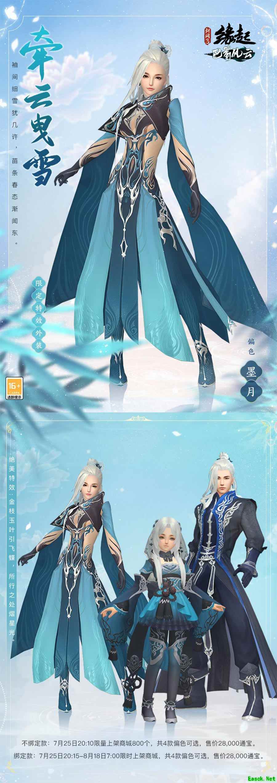 袖间细雪犹几许,苗条春态渐闻东。 特效外装【牵云曳雪】上架商城,共4款偏色可选。不绑定款:7月25日20:10限量上架800个,售价28,000通宝。绑定款:7月25日20:15-8月18日7:00限时上架,售价28,000通宝。 成女款运用绮丽纹饰勾勒曼妙身形。翻领长袖恣意随性,青色条纹若乌火布及全身。蓝黑相融宛如蓝色妖姬,桃羞杏让,妩媚招摇。 成男款采用对襟设计。长款修身外衣搭配皮质护腕,有银丝亮纹跃然其中。行进间仿若素尘中一抹莹莹霜火,文武兼宜,玉树临风。 萝莉款融入大量中国结元素。玄青卷边短裙搭配大蝴蝶结最应少女情怀,银团墨纹繁复有序。身侧繁星点缀金枝生花,活泼可爱,古灵精怪。