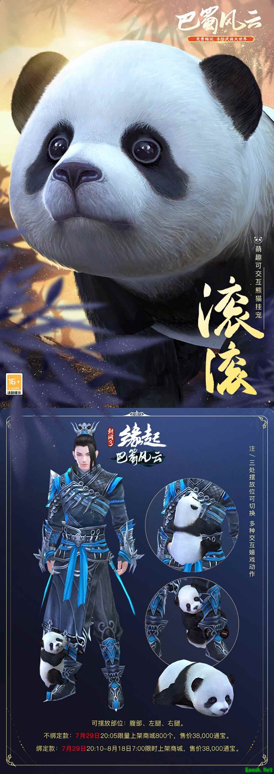 【激萌熊猫 即将来袭】 激萌熊猫滚滚来。【挂宠·滚滚】入住商城,包含三处可切换摆放位,多种交互嬉戏动作。不绑定款:7月29日20:05限量上架800个,售价38,000通宝。绑定款:7月29日20:10-8月18日7:00限时上架,售价38,000通宝。 竹林掩映间怎能缺少一只熊猫呢?【挂宠·滚滚】圆润可爱,软糯甜憨。它会懒洋洋地趴在主人胸口,亦会抱住小腿卖萌撒娇,还有更多超激萌人熊互动待侠士探索!巴蜀风云即将来临,快把憨态可掬的它领回家!