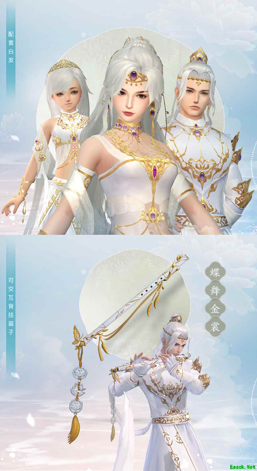 巴蜀江南亦西域,绫罗皮裘总相宜。《剑网3缘起》“巴蜀风云”倒计时3天震撼来袭,多样绝伦外装今日纷呈上线!全新异域外装礼盒【浮光黛月】携可交互背挂竹笛【蝶舞金裳】与特效蝶舞首发亮相;限定特效外装【牵云曳雪】自带金枝玉叶款款而来;月度限定外装【策马弯弓】、精美成衣【洗尘寰】一动一静风格鲜明;还有萌趣可交互熊猫【挂宠·滚滚】7月29日大轴登场!唯美特效背挂【地舆天盖】、巨额优惠橙武拓印券更是夏日出游必备单品。锦罗玉衣,请君一览! 【缤纷新衣 盛夏限定】 琳琅璎珞掠光影,袂如蝉翼人似月。 全新异域外装礼盒【浮光黛月】上架商城,礼盒内包含蝶舞动作特效成衣及定制黑发、定制白发,可交互特效背挂【蝶舞金裳】。不绑定款:7月25日20:05限量上架800个,售价52,000通宝。绑定款:7月25日20:15-8月18日7:00限时上架,售价52,000通宝。 成女款婀娜多姿。金饰璀璨夺目,黛紫玛瑙镶嵌其间。帔帛泛金宛若月夜起舞时染上的宝镜光辉,与缟色丝绸相叠层次尽显。月下美人媚而不妖。 成男款丰神俊朗。黑发微卷饰有亮片,洁白雾縠搭配金饰勾勒,似辉云如焰火。扇形臂环设计大胆别具风味。月下奏笛满是气宇轩昂之感。 萝莉款娇小玲珑 。发若凝雪戴金质王冠,琳琅珠宝修身。亮金臂训装点纤腕,瑰丽宝石搭配金流苏坠于腰间。翩跹间便是芸芸众生中闪烁的明珠。