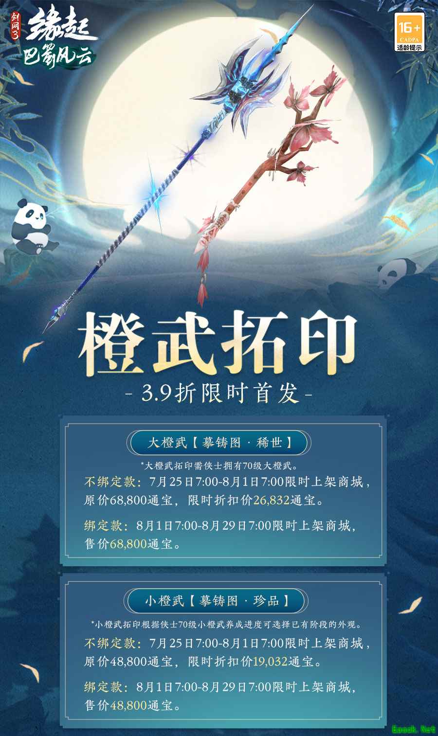 【橙武拓印 巨惠首发】 大小橙武拓印券惊喜上架!绝美武器随心搭配。3.9折巨额优惠仅限一周,心仪侠士请勿错过! 大橙武【摹铸图·稀世】不绑定款:7月25日7:00-8月1日7:00限时上架,享3.9折,折后价26,832通宝。绑定款:8月1日7:00-8月29日7:00限时上架,售价68,800通宝。 小橙武【摹铸图·珍品】不绑定款:7月25日7:00-8月1日7:00限时上架,享3.9折,折后价19,032通宝。绑定款:8月1日7:00-8月29日7:00限时上架,售价48,800通宝。
