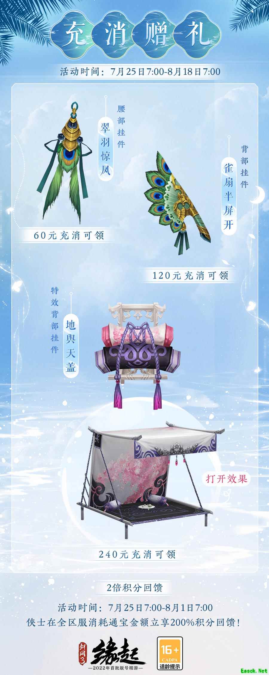 【充消佳礼 纳凉好物】 全新充消清爽来袭!7月25日7:00-8月18日7:00,累计消耗达指定档位,即可分别领取唯美特效背部挂件【地舆天盖】等精美好礼清凉度盛夏(【地舆天盖】:侠士装备后点击召唤帐篷,即可邀同队好友一起欢度惬意时光)。7月25日7:00-8月1日7:00,侠士在全区全服消耗通宝金额还可立享200%积分回馈!