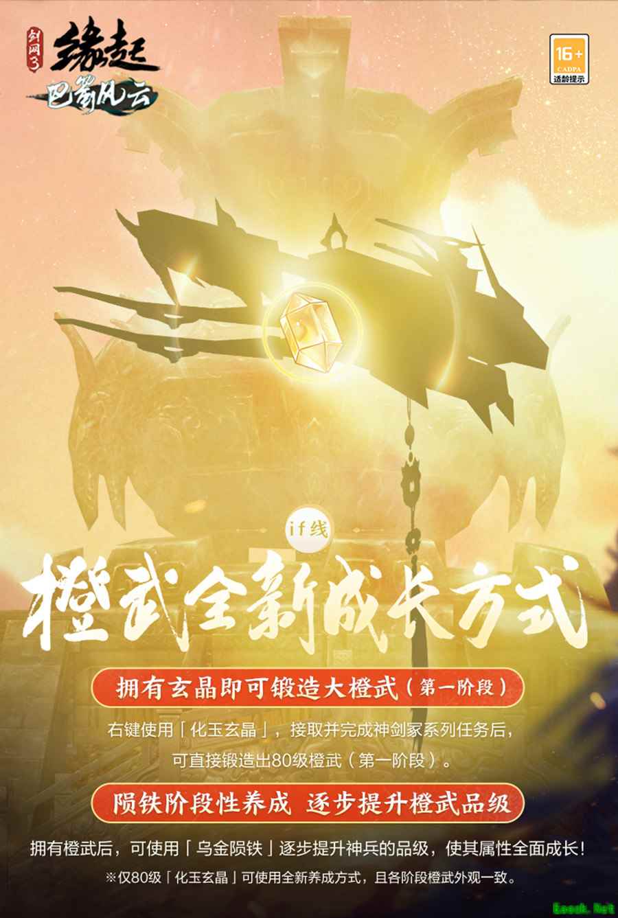 【养成更灵活 玩法再调优】 玄晶即锻,陨铁养成。新赛季“巴蜀风云”上线后,橙武全新成长方式惊喜来袭,拥有【化玉玄晶】即可铸成第一阶段橙武,告别1=200尴尬期!随后可通过搜集【乌金陨铁】为其提升品级,相伴橙武共同成长。