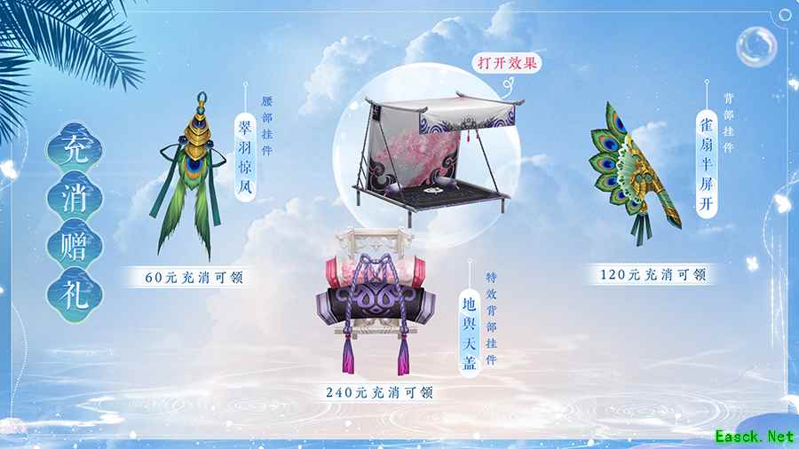 唯美特效背挂【地舆天盖】造型精美,搭配雀羽元素精美挂件,作为夏日好礼赠与群侠。