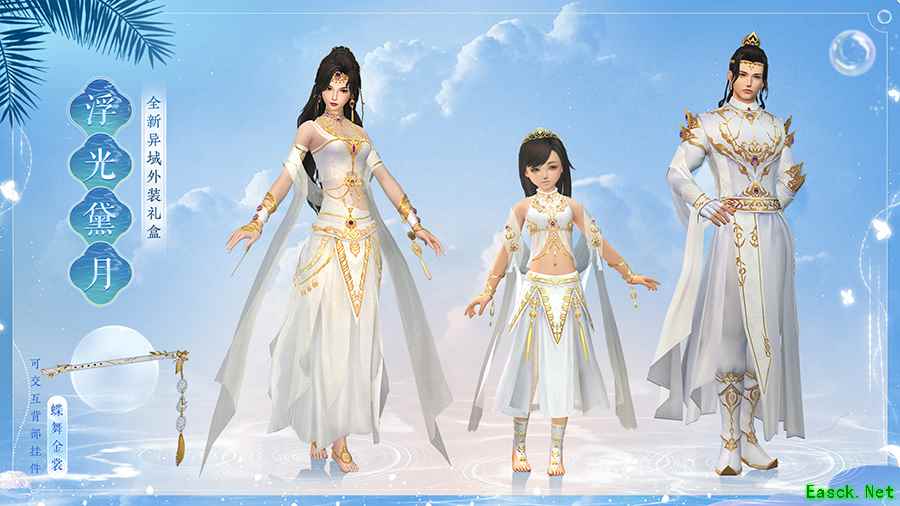 全新异域外装礼盒【浮光黛月】清凉现身,起舞间手揽清光飞蝶相伴,竹笛【蝶舞金裳】笛声袅袅百转千回,又会勾起谁的星月情怀?