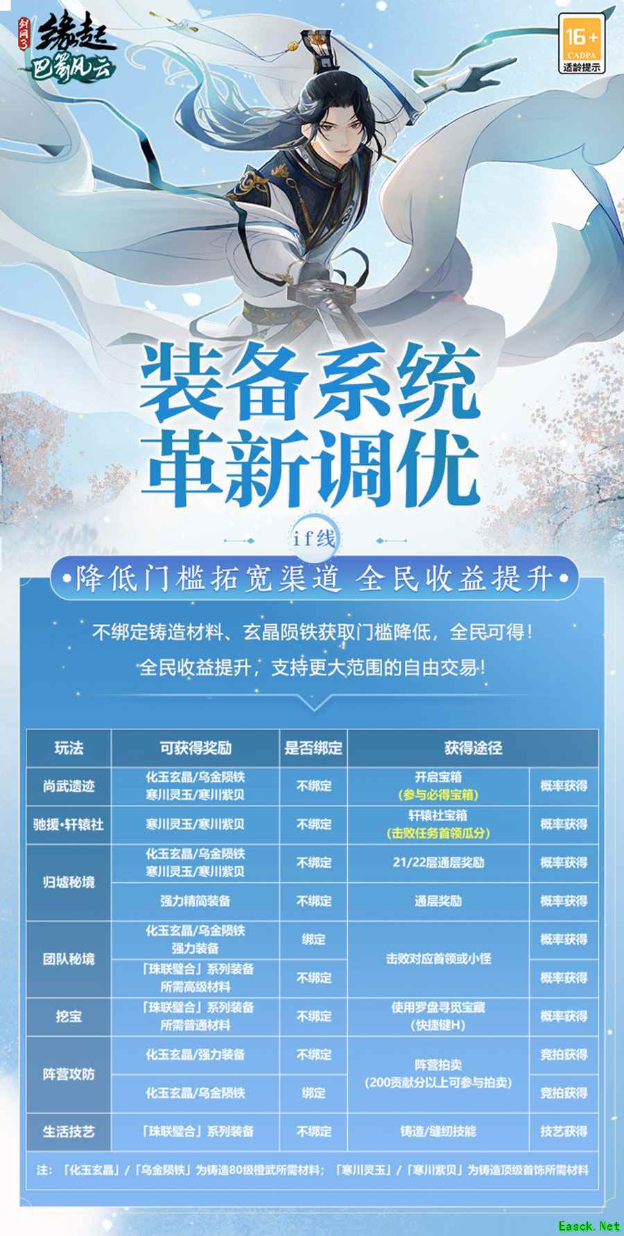 装备可易,多元获取。新赛季“巴蜀风云”上线后,装备系统全盘调优!降低门槛拓宽渠道、装备镕铸灵活养成、强化减负收益提升!不绑定玄晶陨铁/极品材料获取门槛降低,更多获取渠道同步开放,自由交易范围扩大,助力群侠独步江湖!