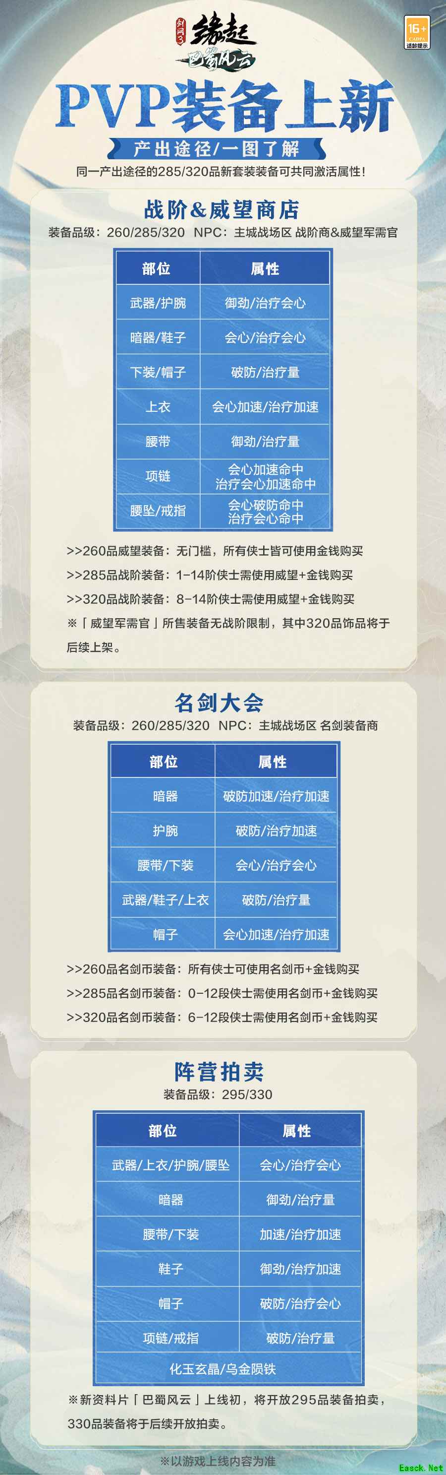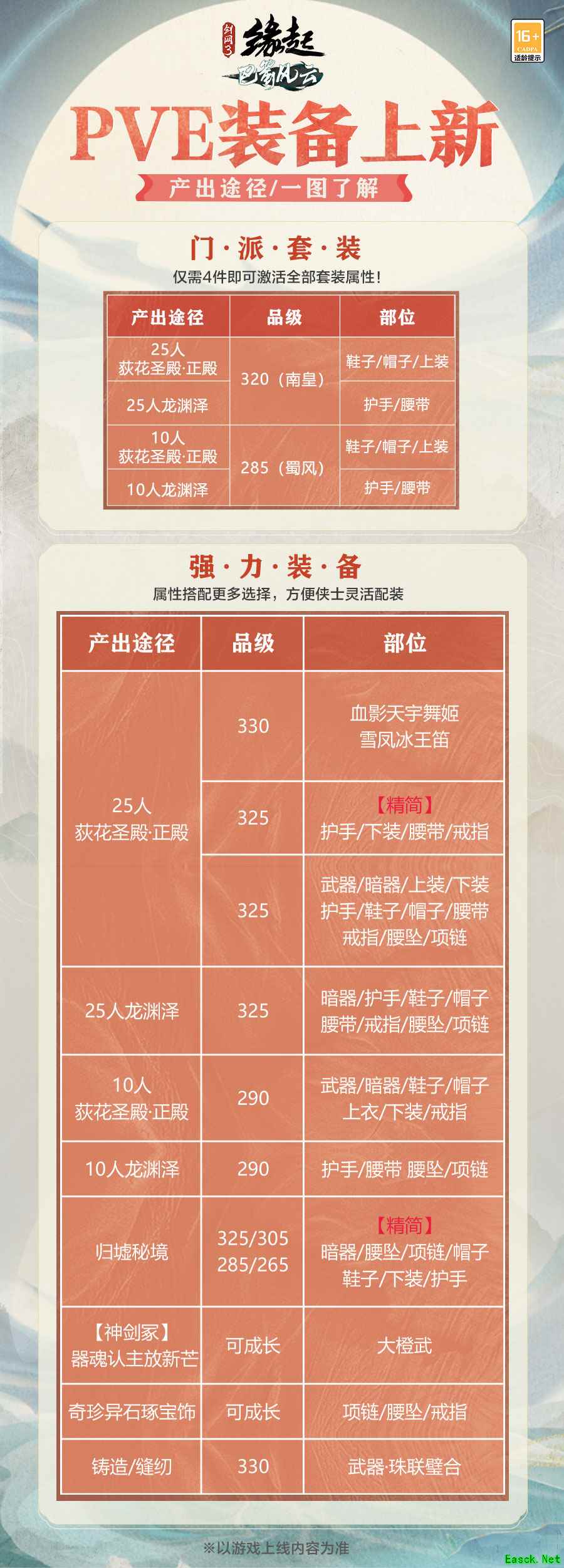 装备产出,一图明晰。大批强力装备将在“巴蜀风云”上线后崭新登场!门派套装仅需集齐四件即可触发全部套装属性,配装更灵活多样;副本装备产出途径丰富,对抗装备三大来源属性独特,一图汇总以便侠士自由配装!