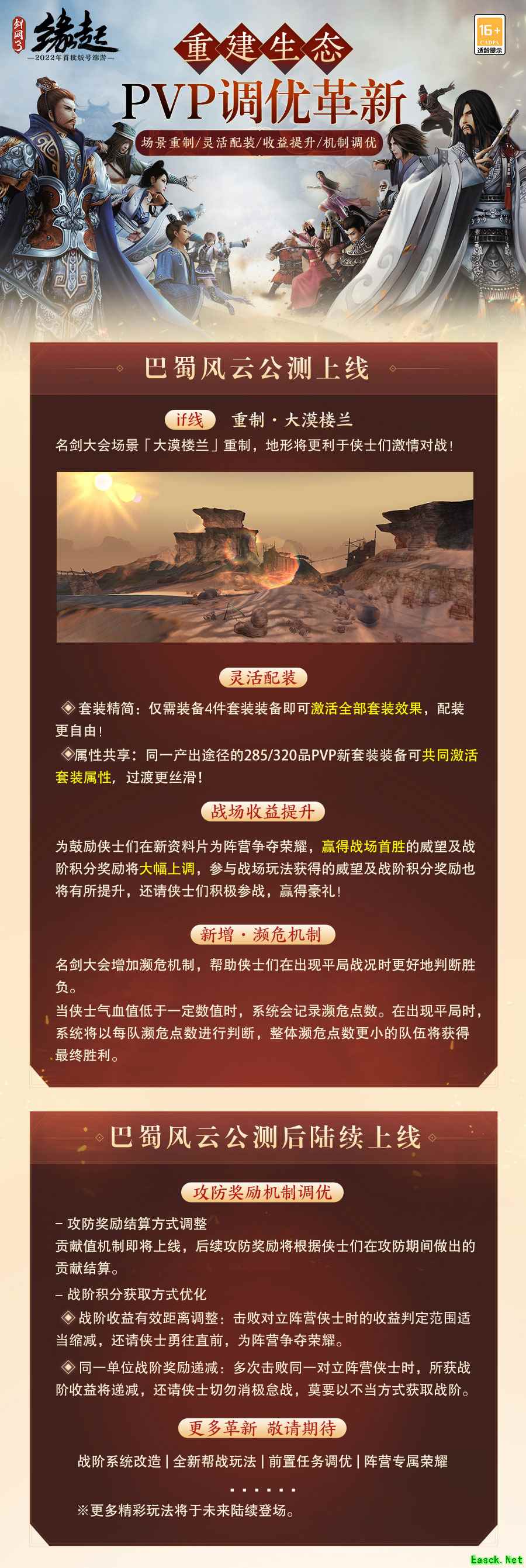 【竞技新场景 对抗迎革新】 楼兰飞沙,竞技革新。名剑大会场景【大漠楼兰】即将重制升级,“濒危机制”引入更显战况焦灼!配装灵活减负、战场收益提升助力侠士傲然江湖。更有攻防积分获取、奖励结算机制等众多对抗玩法调优即将上线,敬请侠士期待!