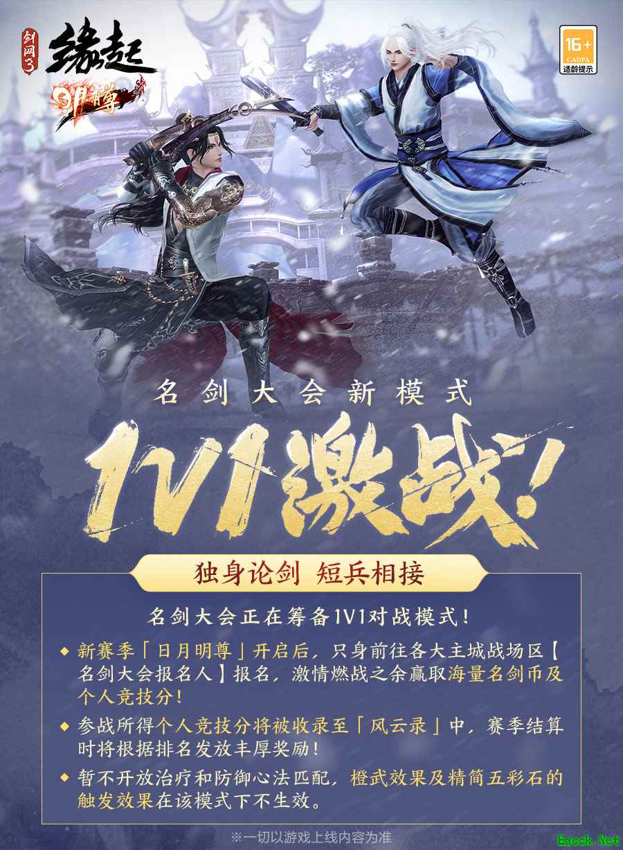 三更夜雨,八方奔袭,闻有战意鸣天明。《剑网3缘起》新赛季“日月明尊”公测定档3月30日,新赛季开始最后倒计时!新门派明教即将现世,体验服火热开测中!竞技场新玩法即将上线,全新1V1模式待侠来战!更有海量新赛季上线玩法内容,马驹捕获、驯养来袭,全新据点战对抗玩法待侠与同胞一同前去助战!详情要闻,请君一览。 【名剑大会烽烟起 竞技模式焕新升级】 好武者酣战淋漓,善谋者弈局纵横。名剑大会新增1V1对局模式,新赛季日月明尊开启后,侠士可前往各大主城战场区【名剑大会报名人】处通过散排匹配参与该玩法,快意对战!【决战?乐山大佛窟】将作为1V1专属对战场景!各门派对战时会禁止使用部分武学招式,绝世神兵和精简五彩石的触发效果在1V1对局模式下不生效。通过对局胜负情况可获得相应名剑币奖励,个人积分将计入“风云录-名剑大会排名-1V1排名”,获得丰厚排行榜奖励!