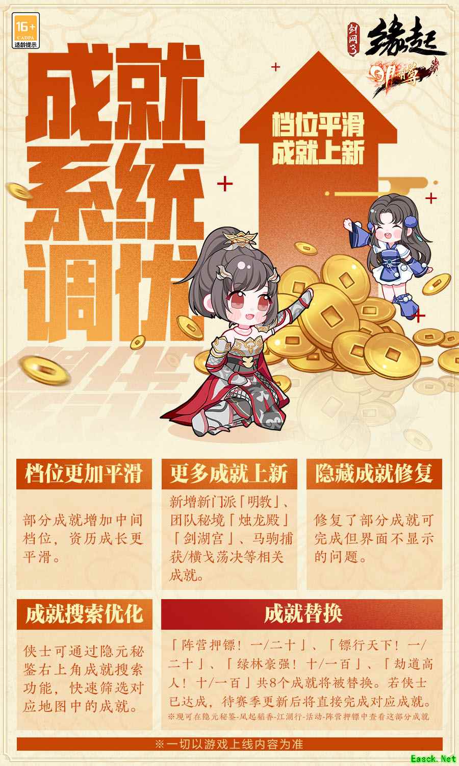 【成就上新档位平滑 成就系统调优升级】 成就系统焕新调优,新赛季日月明尊开启后,新增更多成就,侠士探索江湖的每一步皆有所得!增加成就中间档位,资历成长更平滑;成就搜索优化快速筛选对应地图成就,部分成就替换,成就显示问题同步修复!