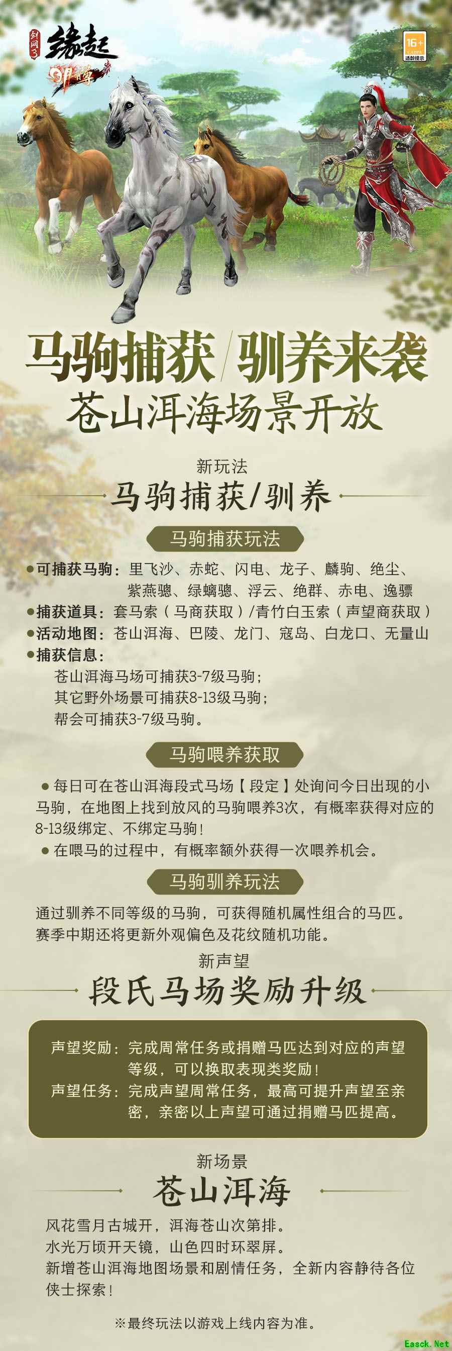 【马驹捕获驯养来袭 苍山洱海场景开放】 风花雪月古城开,苍山洱海次第排。新赛季日月明尊开启后,新增苍山洱海地图场景和剧情任务,全新内容静待各位侠士探索!同时马驹捕获及驯养玩法上线,千里宝马待侠捕获,更有新段式马场声望奖励和声望任务,更多趣味内容等侠体验!