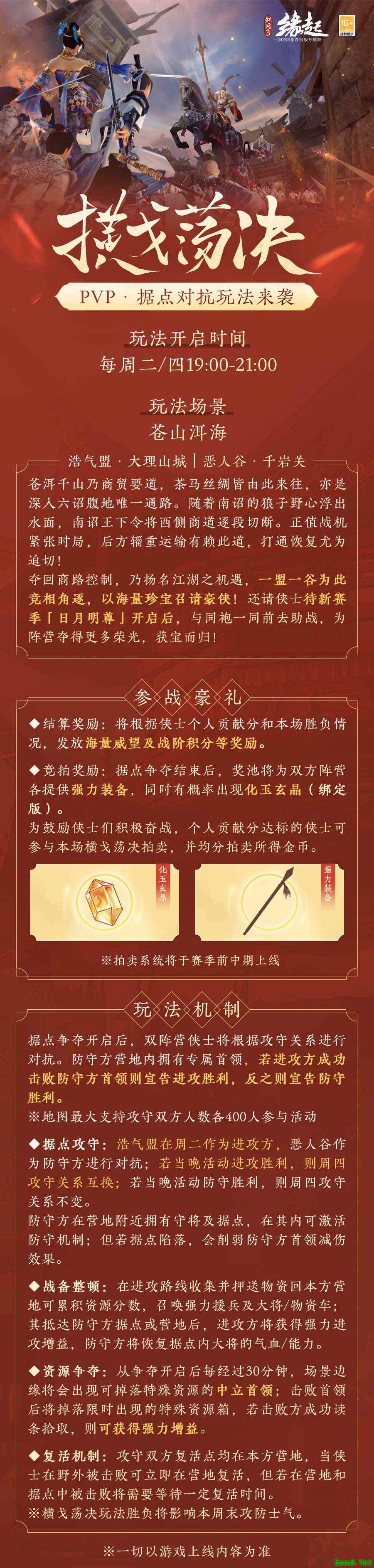 【横戈荡决角逐起 据点对抗玩法来袭】 刀剑会逢,不战不休。苍山洱海乃商贸要道,夺回商路乃扬名江湖之机遇,一盟一谷为此竞相角逐,以海量珍宝召集豪侠!还请侠士待新赛季日月明尊开启后,与同胞一同前去助战,为阵营夺得更多荣光!