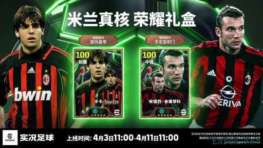 活动一览 — 豪门底蕴,红黑功勋登场 — 米兰真核 荣耀礼盒 王朝功勋 高光 特级经纪人 (兑换保底) — 米兰周年庆活动 — 米兰125周年 盛典任务 卡卡&舍甫琴科 挑战赛 AC米兰 超级在线对抗赛 (卡卡或舍甫琴科试用) AC米兰125周年 七日挑战赛 活动详情 豪门底蕴,红黑功勋联袂登场 米兰真核 荣耀礼盒 在【米兰真核 荣耀礼盒】活动期间,抽取礼盒即有概率获得【荣耀值】。使用【荣耀值】可以兑换【双增能史诗高光卡卡】、【双增能史诗高光舍甫琴科】以及其对应的皮肤【卡卡-漫画】和【舍甫琴科-漫画】等其他道具奖励,累计抽取次数还可以获取高光经纪人&传奇经纪人等奖励!