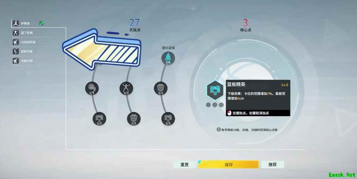 “天赋”就更好理解了,类似于MOBA游戏中的“符文”系统。你可以在“天赋”中搭配自己的专属球员方案。使用天赋点对球员的特定领域进行加成,如“护框者”就是以抢篮板为核心目的的加成,每个小天赋都针对篮板提升了小幅度百分比,核心点则是更强力的强化效果!
