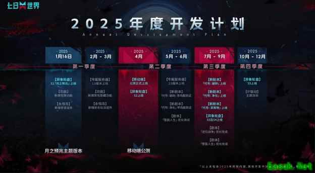 各位超越者们,大家好!年度发布会大家都看了么?没来看的超越者们也别着急,此次特地为大家速速整理了本次发布会最重要的信息,新剧本新规划超全盘点,看完这篇就够了! 01 移动端上线定档 Mobile Official Release 关于超越者们最关心的移动端定档时间,本次发布会带来了首次官宣!我们将在2025年4月,在全球范围内正式上线七日世界手游。现在前往官网预约,还可获得丰厚公测福利和豪礼抽奖!