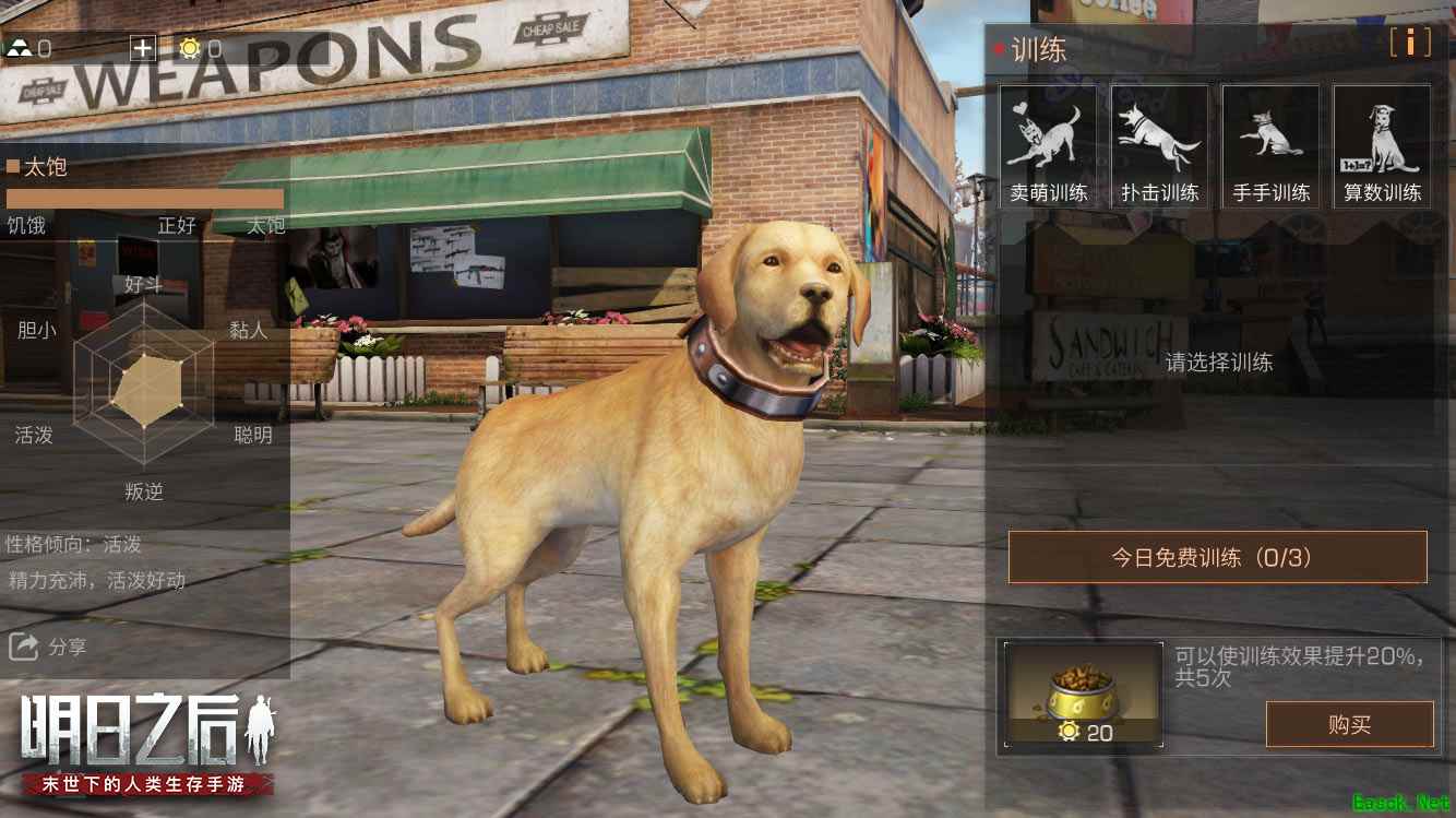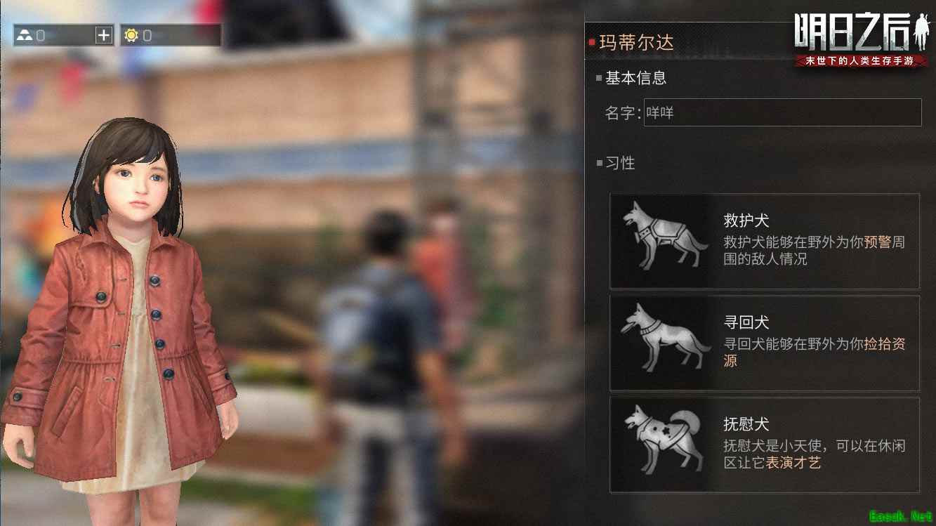 在与主人的互动层面,狗狗的爱不再是一个简单的数值。随着主人与狗子的爱的提高,你们之间的互动配合也会更加默契,幸存者的情绪和状态都会被你身边的敏感的小家伙感受到,当出现危急时刻,它甚至愿意为了你与强大的敌人进行搏斗。 在狗狗的爱逐渐深厚的过程中,你将可以更加深入的了解狗狗的故事,还能在回忆录里记录与狗狗互动的点点滴滴。 在外观上,每个品种的狗有多种染色方案,同时狗狗的体重会根据幸存者的喂食量而改变。 除了具有天生的脾气之外,幸存者可以通过训练和玩耍,从六个维度影响狗狗的性格。不同性格特征的狗子,跟主人互动的方式也会有差异。
