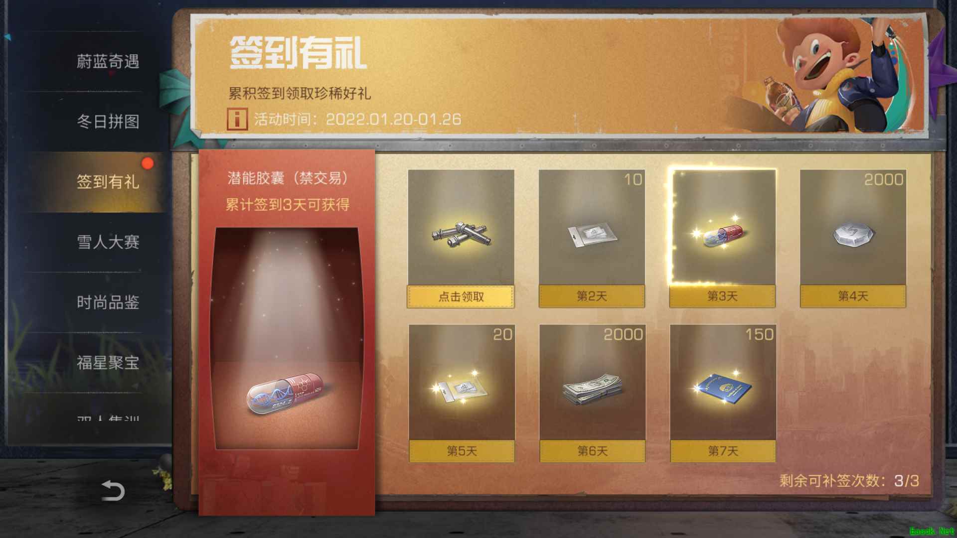 【签到有礼 奖励送不停】 1月20日到26日期间,签到有礼活动继续为幸存者们带来丰厚的奖励,每日登录可获得一次领取的机会。如果因为忙碌错过了也不要怕,还可以补签。幸存者们快来签到领取奖励,在新年到来前准备好自己的跨年物资!