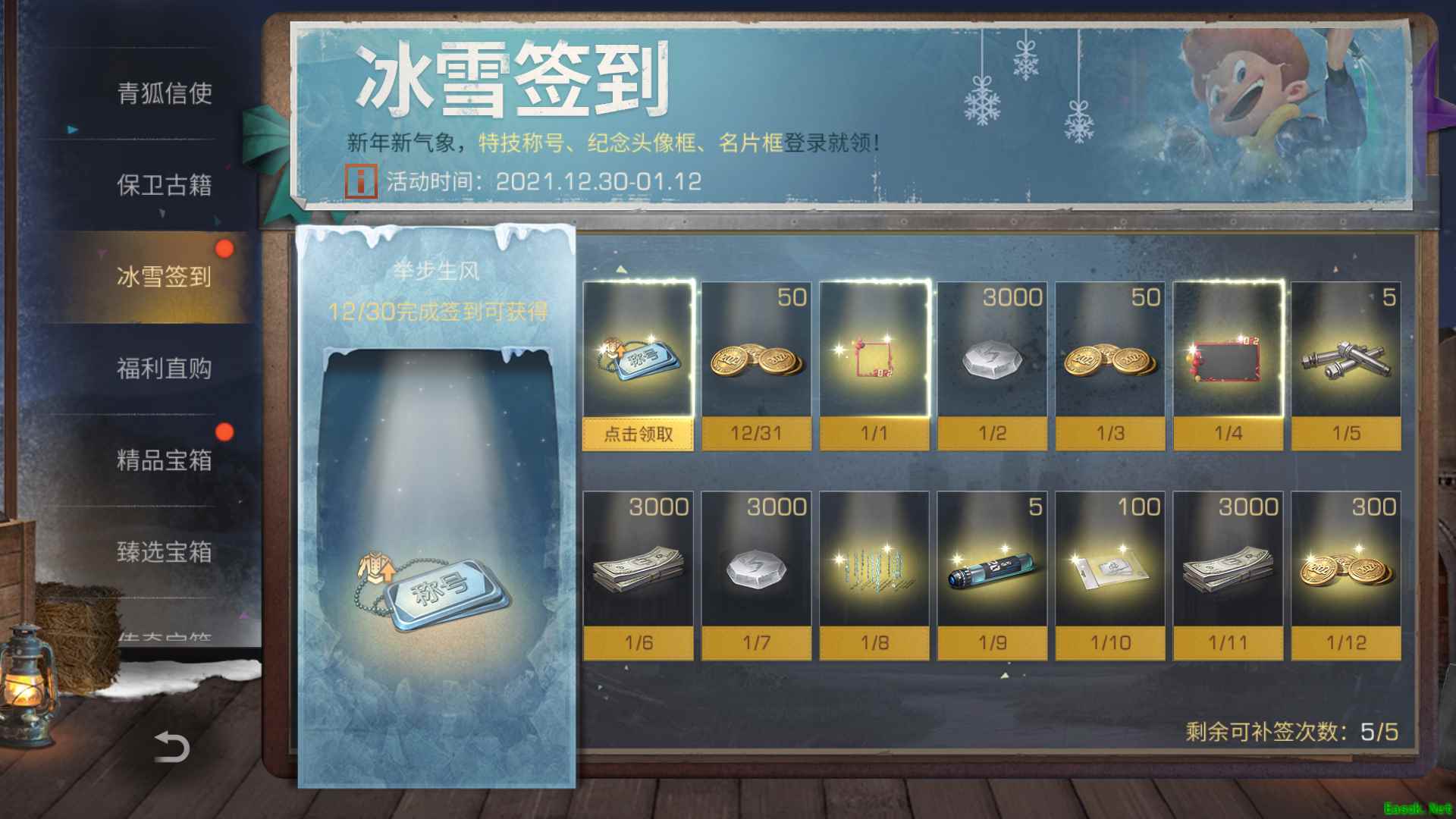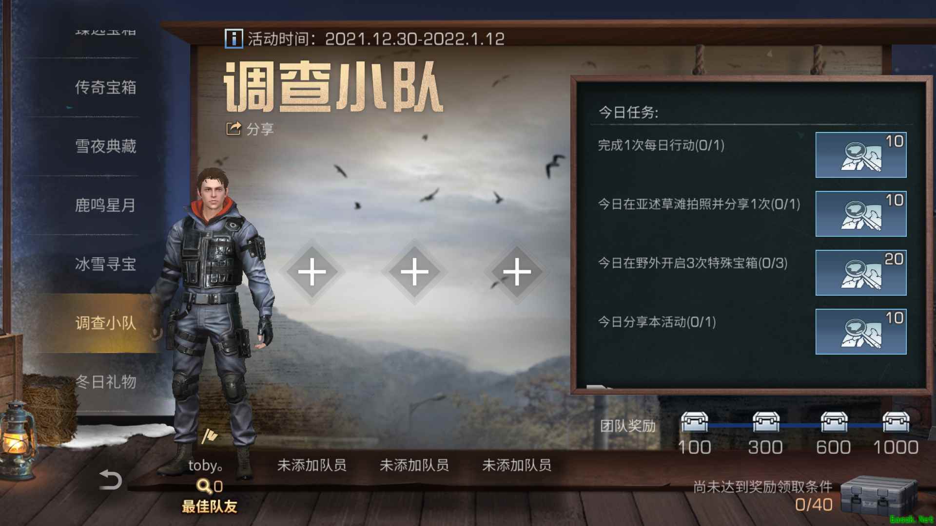 【冰雪寻宝 找到未知的宝藏】 在12月30日至明年的1月12日期间,各位幸存者可以在野外找到浮在水面上的宝箱获得奖励和寻宝积分。积分用来提升寻宝专家等级,等级越高,每日开箱的奖励越好,究竟谁才是下一位寻宝专家?