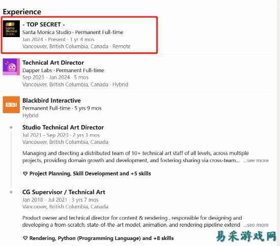 据Zuby_Tech分享的消息,曾参与过知名游戏《热血无赖》(Sleeping Dogs)开发的技术美术总监Jim Spoto,目前已加入索尼圣莫妮卡工作室,并且正在参与一个“最高机密”(TOP SECRET)的项目。 领英页面显示,Jim Spoto于 2024 年 1 月起在索尼圣莫妮卡工作室担任全职工作,项目名称标注为“TOP SECRET”。 圣莫妮卡工作室以开发高质量、高水准的游戏而闻名,其代表作包括《战神》系列等。目前关于这个“最高机密”项目的具体内容尚不得而知,但考虑到圣莫妮卡工作室的辉煌历史,相信这个项目一定会为玩家带来惊喜。 |