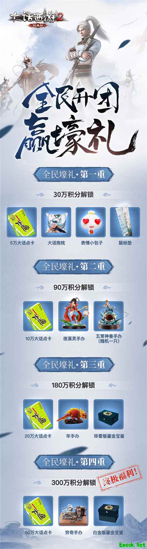 为了感谢大家的喜爱,二哥还偷偷为团友们准备了年手办一只,只要在活动专题内关注二哥,就有机会被二哥抽中哦!4月10日,记得和二哥一起来开团! 全民PK团豪礼相送 梯度奖励内容曝光 【全民PK团】将于4月10日正式开启,加入团队即可累计个人PK季积分,当所有团员总积分达到一定梯度之后还能解锁超级大奖福利!奖励共有四个梯度,珍稀手办、白金版2019鎏金宝鉴、海量点卡通通都有。