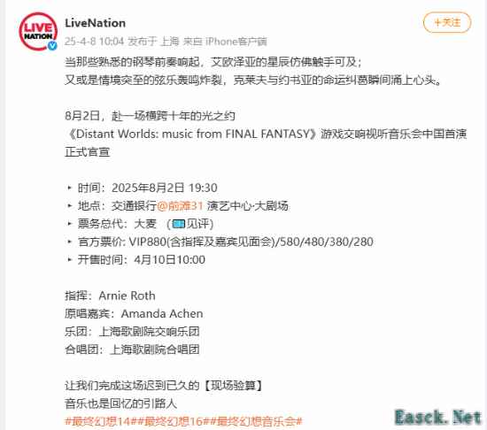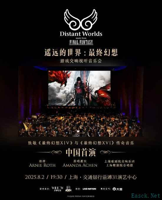 LiveNation官方微博发文宣布,《最终幻想》系列游戏交响视听音乐会“遥远的世界:最终幻想”(Distant Worlds: music from FINAL FANTASY)正式定档,将于8月2日在上海举行中国首演!