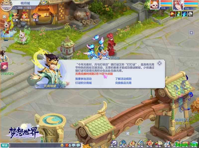 【元宵节活动】 积分换元宵 灯谜大作战 通过参加灯谜活动,玩家可以获得灯谜积分奖励,积分可在元宵神使处兑换不同口味的元宵。食用元宵能够提升资质哦,想变得更强吗?别忘了参加元宵活动哦!