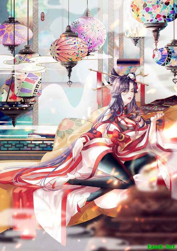 “郭小天”大触利用自己最擅长的梦幻画风,为阿织创造一个皇宫一般的特别场景。屋顶高吊着五彩的琉璃灯笼,在宽大的榻子上,阿织飘逸的秀发就像丝绸一样紧贴在身上,洁白的牙齿和微微张开的双唇,仿佛在向降妖师们诉说这什么。